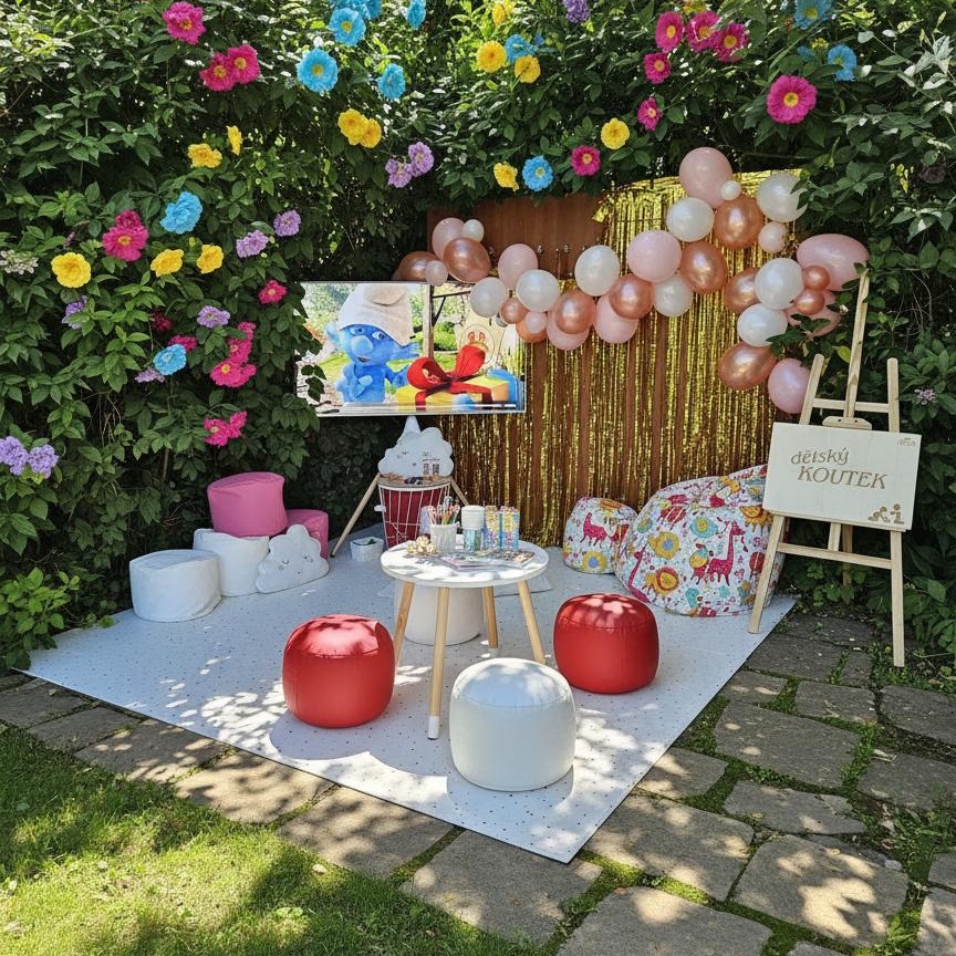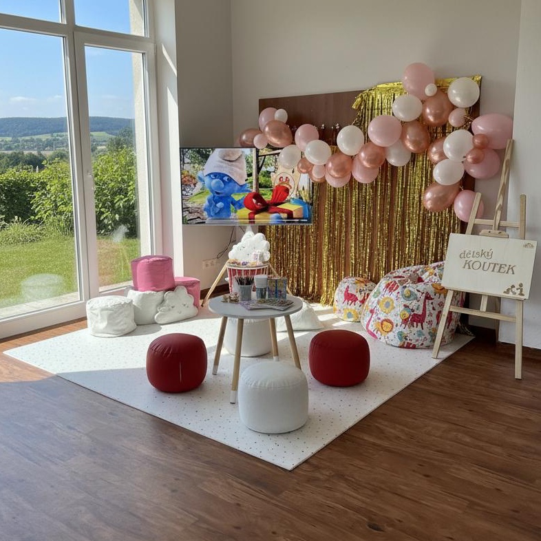 Vše je navrženo tak, aby koutek působil útulně, bezpečně a zároveň esteticky zapadl do svatebního prostředí.