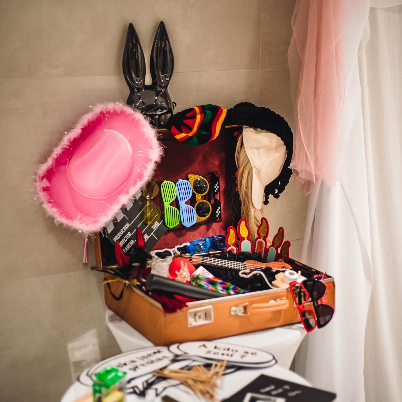 Kufr s rekvizity a 32 bublin s různými texty