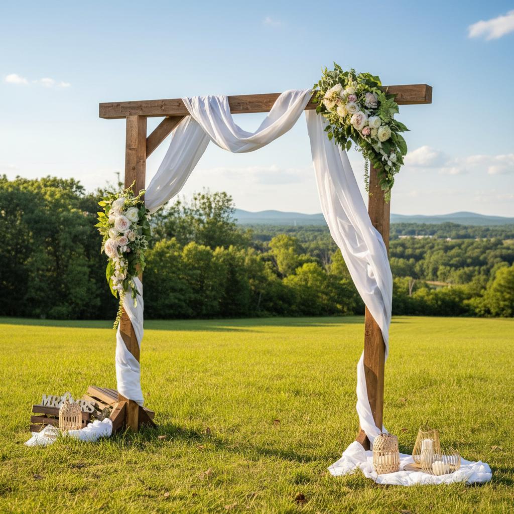 Působivá slavobrána z přírodního tmavého dřeva, která skvěle doplní boho, rustikální i moderní svatební styl. Vytváří elegantní a fotogenické místo pro váš nezapomenutelný obřad, ať už se koná venku pod širým nebem, nebo v útulném interiéru.